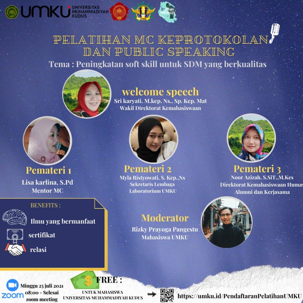 Kudus, 25 Juli 2021 bertepatan pada hari Ahad telah terlaksana Seminar Pelatihan MC, Keprotokoleran, dan Public Speaking dengan tema “Peningkatan Soft Skill Untuk SDM Yang Berkualitas”. Seminar Pelatihan dilaksanakan melalui Zoom Meeting dengan 80 peserta yang terdaftar dan bergabung hingga akhir. Seminar Pelatihan MC, Keprotokoleran, dan Public Speaking diadakan oleh BEM Universitas Muhammadiyah Kudus yang […]