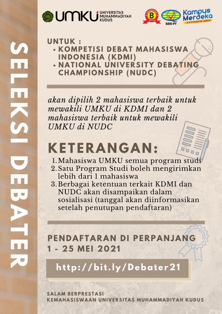 Pada tahun 2021, Puspresnas kembali menyelenggarakan KDMI dan NUDC. KDMI merupakan akronim dari Kempetisi Debat Mahasiswa Indonesia dan NUDC merupakan akronim dari National University Debating Championship. KDMI merupakan kompetisi debat dalam bahasa Indonesia dan NUDC merupakan kompetisi debat dalam bahasa Inggris. Pada kesempatan ini, kemahasiswaan UM Kudus mencoba untuk mempersiapkan dengan baik dengan mengupayakan menjaring […]